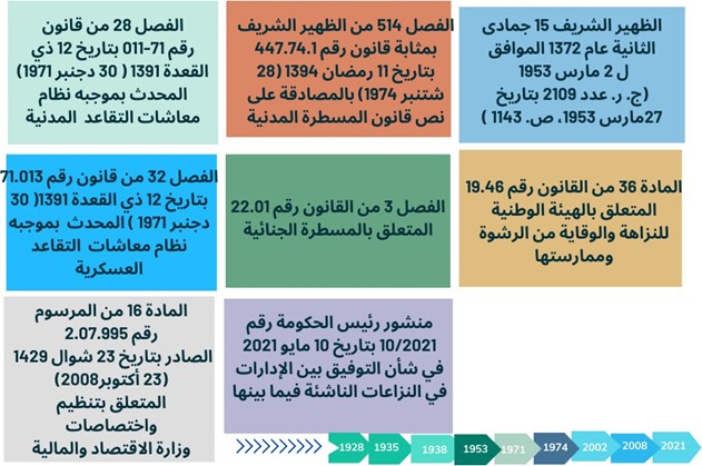 [17] تنص المادة 8 من القانون 41.90 على أن المحكمة الإدارية تختص ، مع مراعاة أحكام المادتين 9 و11 من هذا القانون، بابتداءا في طلبات إلغاء قرارات السلطات الإدارية بسبب تجاوز السلطة وفي النزاعات المتعلقة بالعقود الإدارية ودعاوى التعويض عن الأضرار التي تسببها أعمال ونشاطات أشخاص القانون العام، ماعدا الأضرار التي تتسببها في الطريق العام مركبات أيا كان نوعها يملكها شخص من أشخاص القانون العام. وتختص المحاكم الإدارية كذلك بالنظر في النزاعات الناشئة عن تطبيق النصوص الشرعية والتنظيمية المتعلقة بالمعاشات ومنح الوفاة المستحقة للعاملين في مرافق الدولة أو الجماعات المحلية أو المؤسسات العامة أو مجلس النواب أو مجلس المستشارين أو موظفي أو أعوان مجلس المستشارين….إلخ