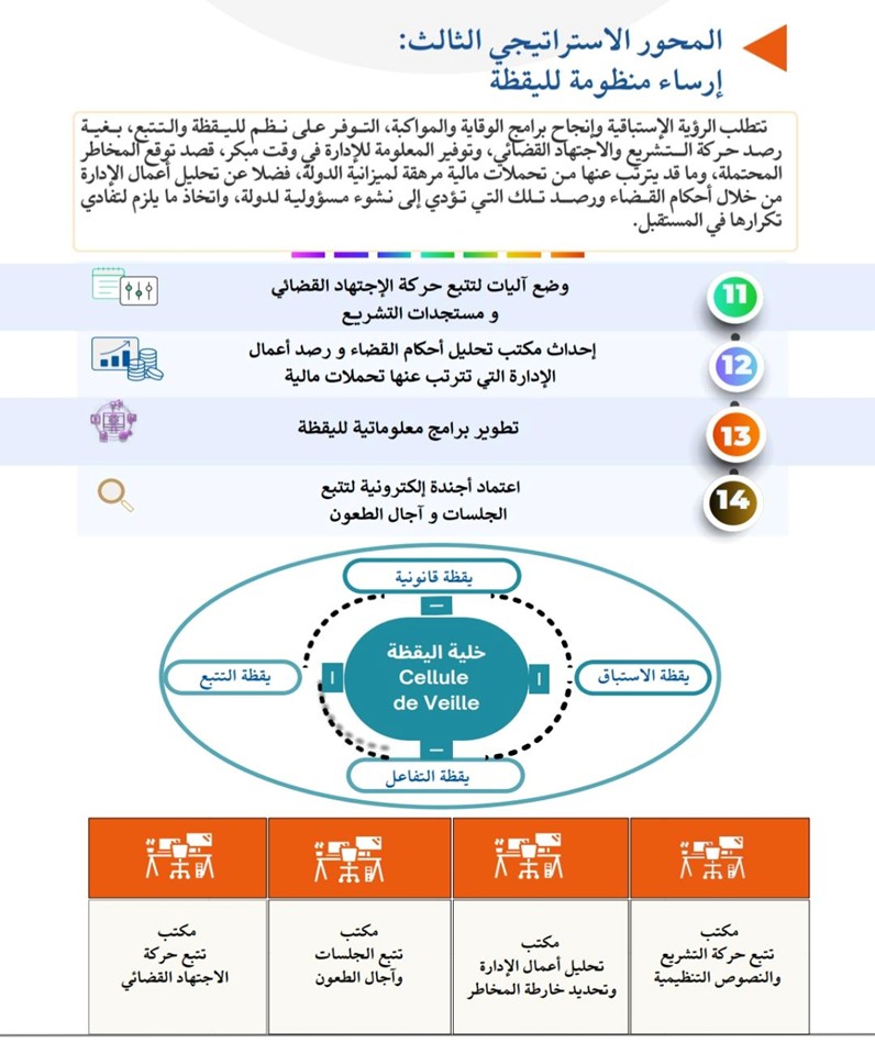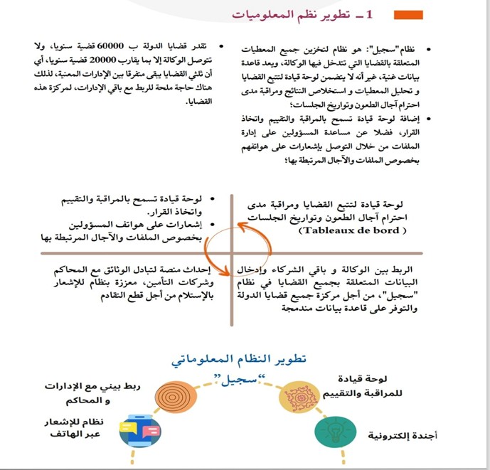 والآن سنتحدث عن أهم المجالات التي تسعى الوكالة القضائية للمملكة لتطويرها لتصبح جهازا فعلا في تدبير المنازعات والوقاية منها، وهي مجموعة من الخطاطات المأخوذة من النشرة التفصيلية للوكالة القضائية للمملكة ألية للرصد والتحليل والرفع من مستوى القانوني العدد 2و 3 لسنة 2024 .