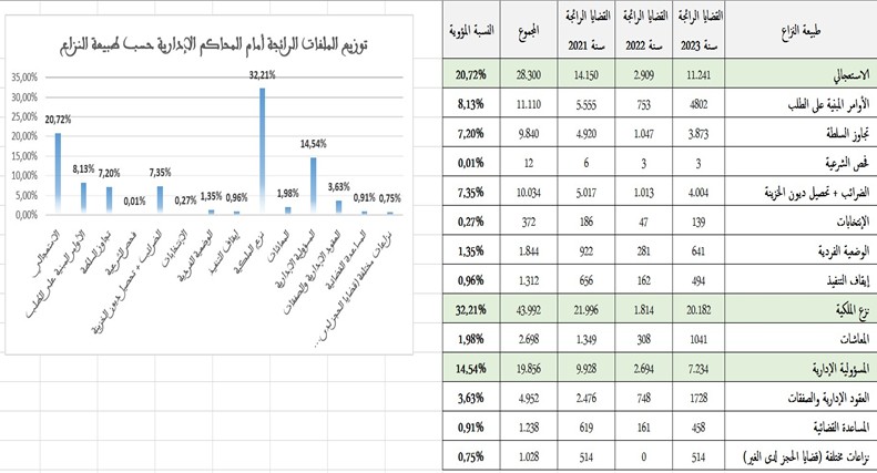 توزيع الملفات الرائجة أمام المحاكم الإدارية حسب طبيعة النزاع: