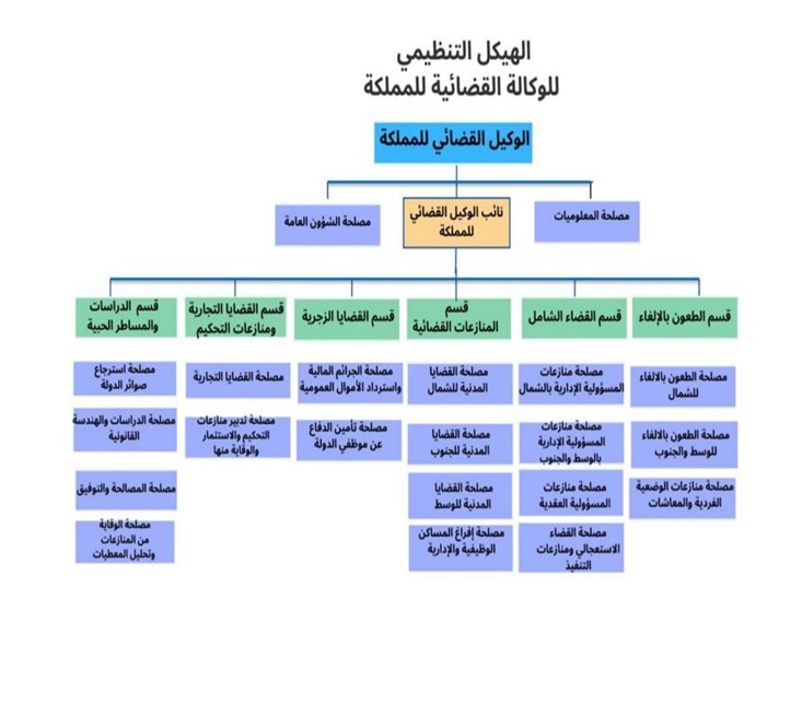تضم الوكالة القضائية للمملكة ست أقسام و مصلحتين مرتبطتين مباشرة بالوكيل القضائي و هي :